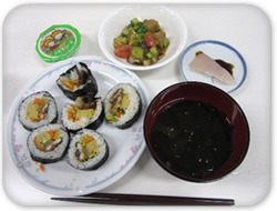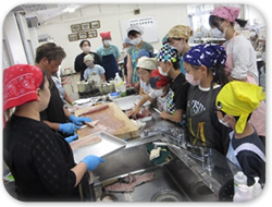 まず、講師による実演を行い、大きなカンパチの解体を間近で見学していただきました。みなさんエラや内臓を取り出したり、大きな頭を落としたりしているのを真剣なまなざしで観察されていました。普段はなかなか体験できない実物を見ながらの説明はとても分かりやすく、また生き物の命をいただいているということを実感するよい機会だったと思います。次に、参加者は講師に教えてもらいながらいわしを手開きし、さらにいわしの蒲焼きキンパ風を作りました。魚を自分で捌くという作業が初体験の親子も多く、少し戸惑う姿も見られましたが、1尾、2尾と開いていくうちに慣れていき、親子で一から協力して作り上げた料理は味もさることながら、達成感があり全員が満足そうでした。試食中は和気あいあいとした雰囲気がとても印象的でした。試食後の講師の先生への質疑応答の時間では、「今までとった魚で一番大きな魚は何ですか」、「いつも何時に起きていますか」、「キンパの具材の卵焼きの分量を教えてください」、「煮つけ、お吸い物以外に美味しい食べ方を教えてください」など講師の先生の仕事や料理に関してたくさんの質問がありました。